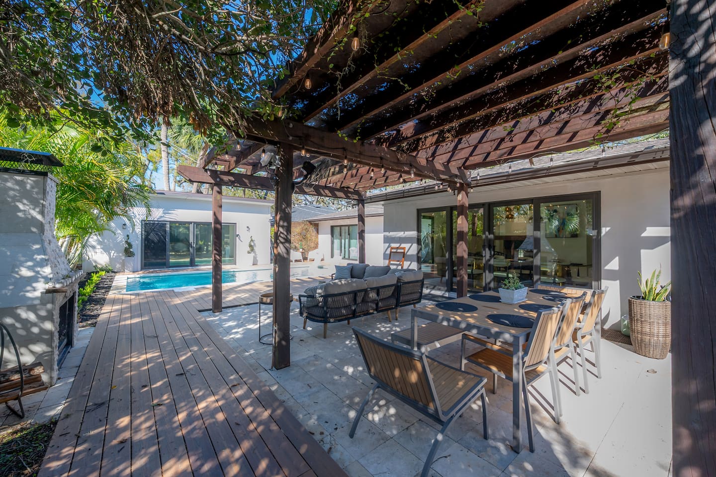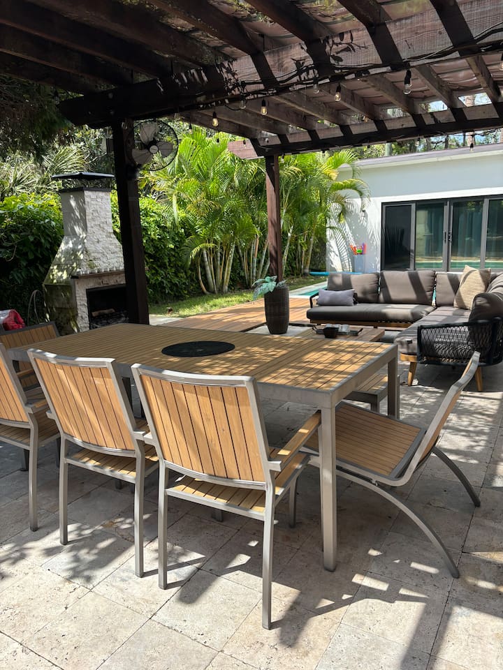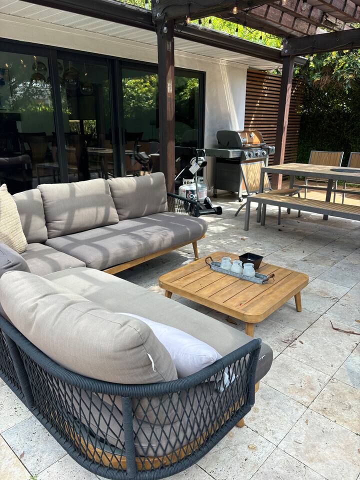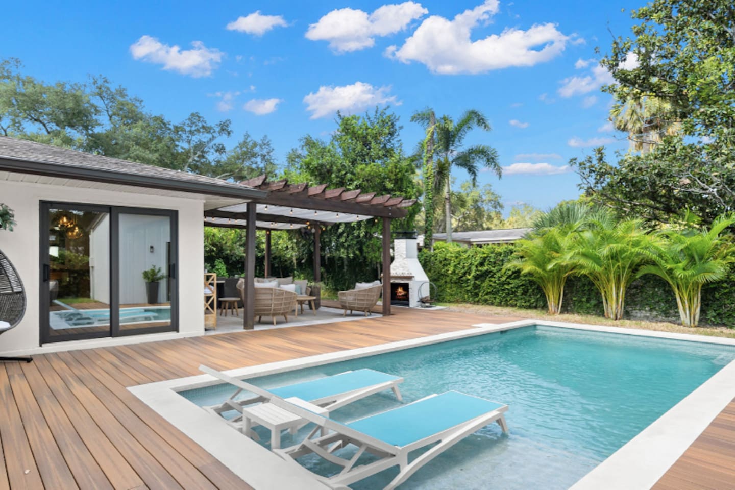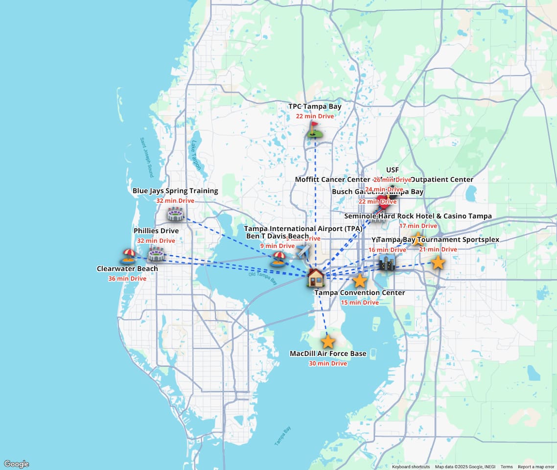 Experience Villa Bella Vita, a one-of-a-kind executive villa in Tampa. This 3BR/3BA home blends luxury and comfort with a heated pool, outdoor fireplace, and curated designer furnishings from RH, West Elm, and more. Ideal for couples, corporate stays, or upscale retreats. The Space ✔ 3 Bedrooms | 3 En-Suite Baths | All with smart Tv's ✔ 1 King (Master) | 2 Queens (Guest Rooms) ✔ 2 Twin Memory Foam Folding Beds ✔ TVs in every bedroom ✔ Thermador kitchen + giant chef’s island ✔ Hotel-grade linens & luxury finishes Outdoor Living ✔ Heated pool with Ledge Loungers ✔ Private fenced yard ✔ Weber Genesis Grill with Gas ✔ Outdoor fireplace, Pergola, & resort-style seating ✔ Optional add on use of Cabana with extra Bed and Bath Please note: Guest house not included. If you need a 4th bedroom + bath, inquire about booking the full property. The guest house is not rented separately so if you book there will not be other guests occupying or sharing space. Indoor fireplace is decorative only. Not child-friendly. Why guests love it 👨👩👧 Single-level home (no stairs), fenced yard, Weber Grill minutes from everything! 💻 Digital Nomads: fast Wi-Fi, Ethernet, dedicated workspace, quiet neighborhood yet close to downtown. 💕 Couples: king suite, private pool, upscale Mid century modern vibe—perfect for a romantic escape. Location highlights 15 min → Busch Gardens & Adventure Island 10 min → Steinbrenner Field Raymond James Stadium Amalie Arena (Now Benchmark International Arena) 15 min → USF & Moffitt Cancer Center 10 min → Downtown Tampa, Riverwalk, Armature Works 5 min → Tampa International Airport 30–40 min → Beaches & Clearwater