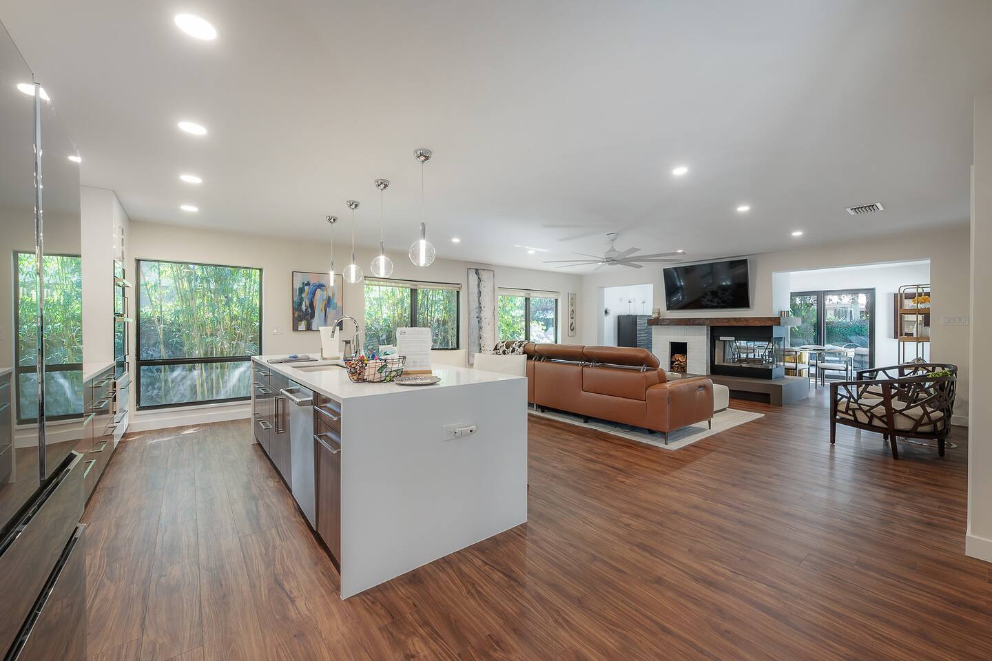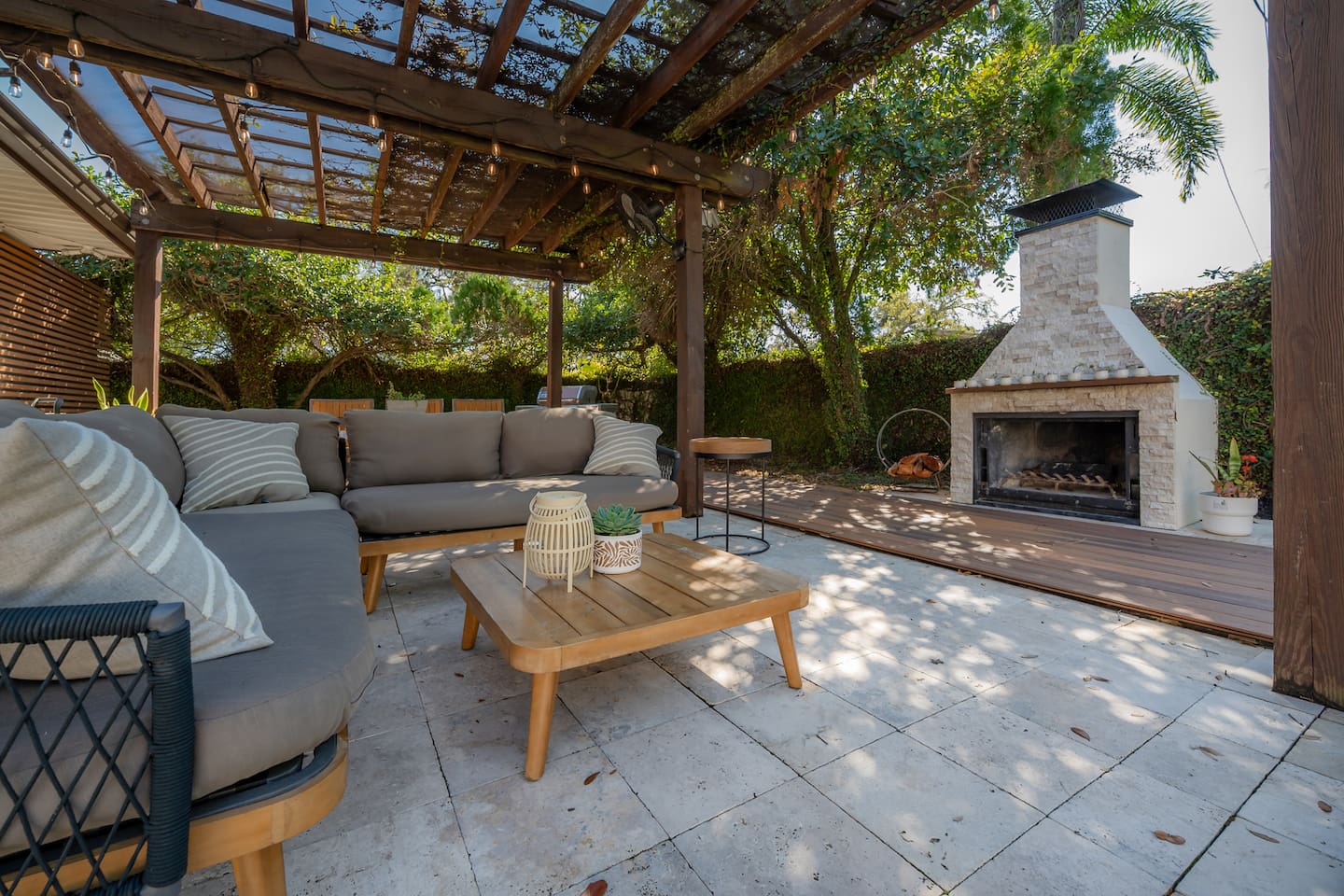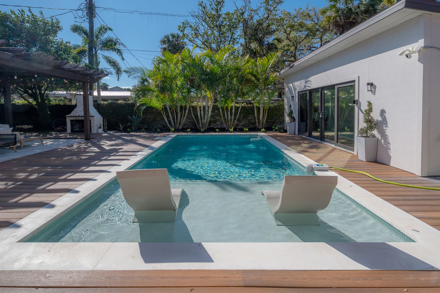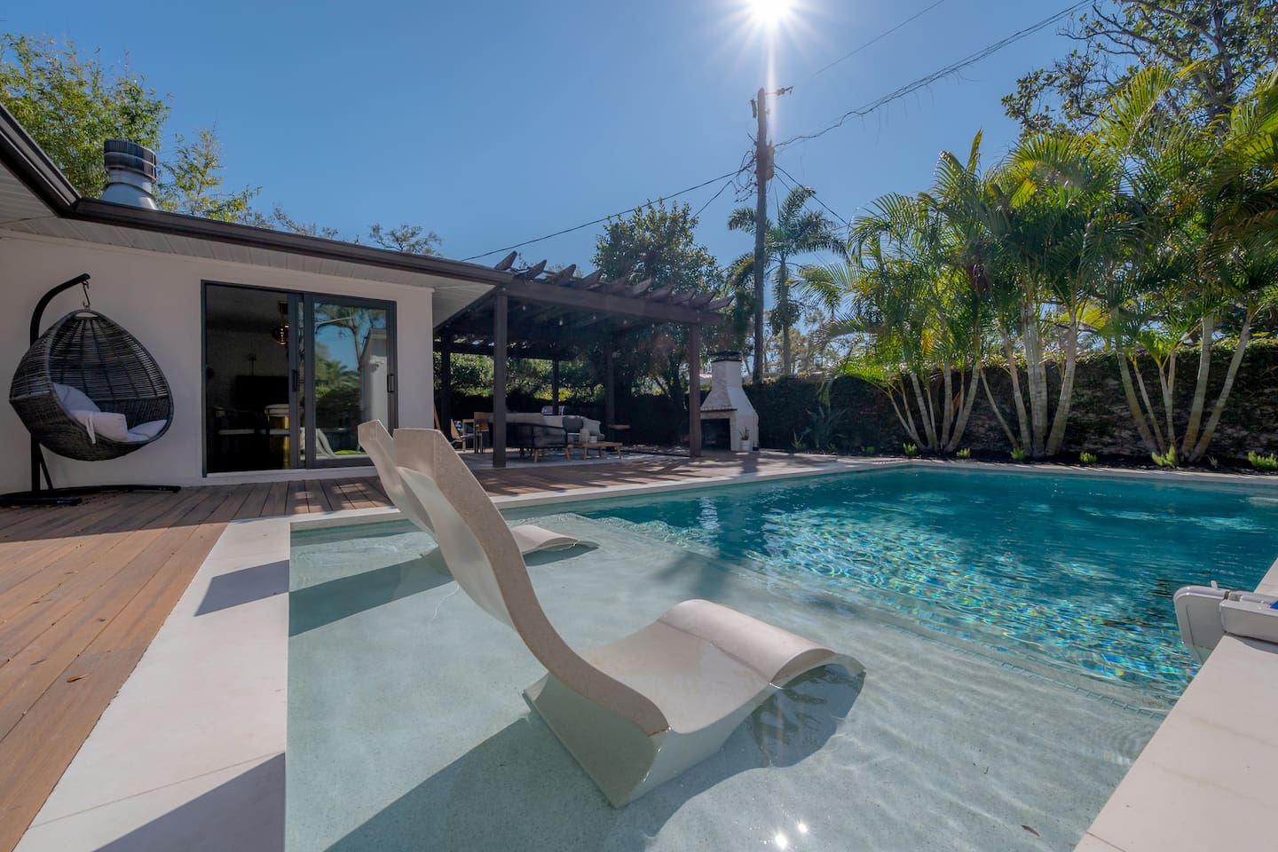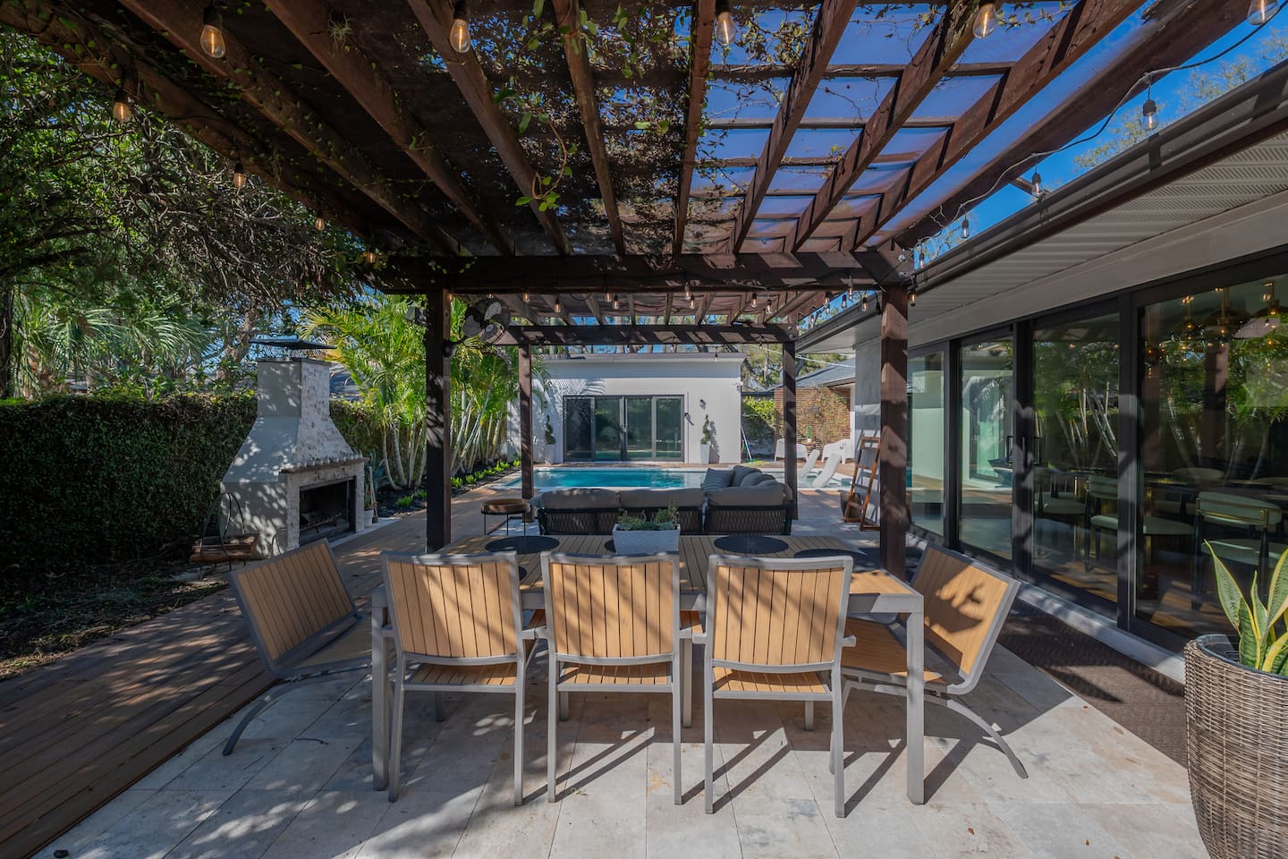 Experience Villa Bella Vita, a one-of-a-kind executive villa in Tampa. This 3BR/3BA home blends luxury and comfort with a heated pool, outdoor fireplace, and curated designer furnishings from RH, West Elm, and more. Ideal for couples, corporate stays, or upscale retreats. The Space ✔ 3 Bedrooms | 3 En-Suite Baths | All with smart Tv's ✔ 1 King (Master) | 2 Queens (Guest Rooms) ✔ 2 Twin Memory Foam Folding Beds ✔ TVs in every bedroom ✔ Thermador kitchen + giant chef’s island ✔ Hotel-grade linens & luxury finishes Outdoor Living ✔ Heated pool with Ledge Loungers ✔ Private fenced yard ✔ Weber Genesis Grill with Gas ✔ Outdoor fireplace, Pergola, & resort-style seating ✔ Optional add on use of Cabana with extra Bed and Bath Please note: Guest house not included. If you need a 4th bedroom + bath, inquire about booking the full property. The guest house is not rented separately so if you book there will not be other guests occupying or sharing space. Indoor fireplace is decorative only. Not child-friendly. Why guests love it 👨👩👧 Single-level home (no stairs), fenced yard, Weber Grill minutes from everything! 💻 Digital Nomads: fast Wi-Fi, Ethernet, dedicated workspace, quiet neighborhood yet close to downtown. 💕 Couples: king suite, private pool, upscale Mid century modern vibe—perfect for a romantic escape. Location highlights 15 min → Busch Gardens & Adventure Island 10 min → Steinbrenner Field Raymond James Stadium Amalie Arena (Now Benchmark International Arena) 15 min → USF & Moffitt Cancer Center 10 min → Downtown Tampa, Riverwalk, Armature Works 5 min → Tampa International Airport 30–40 min → Beaches & Clearwater