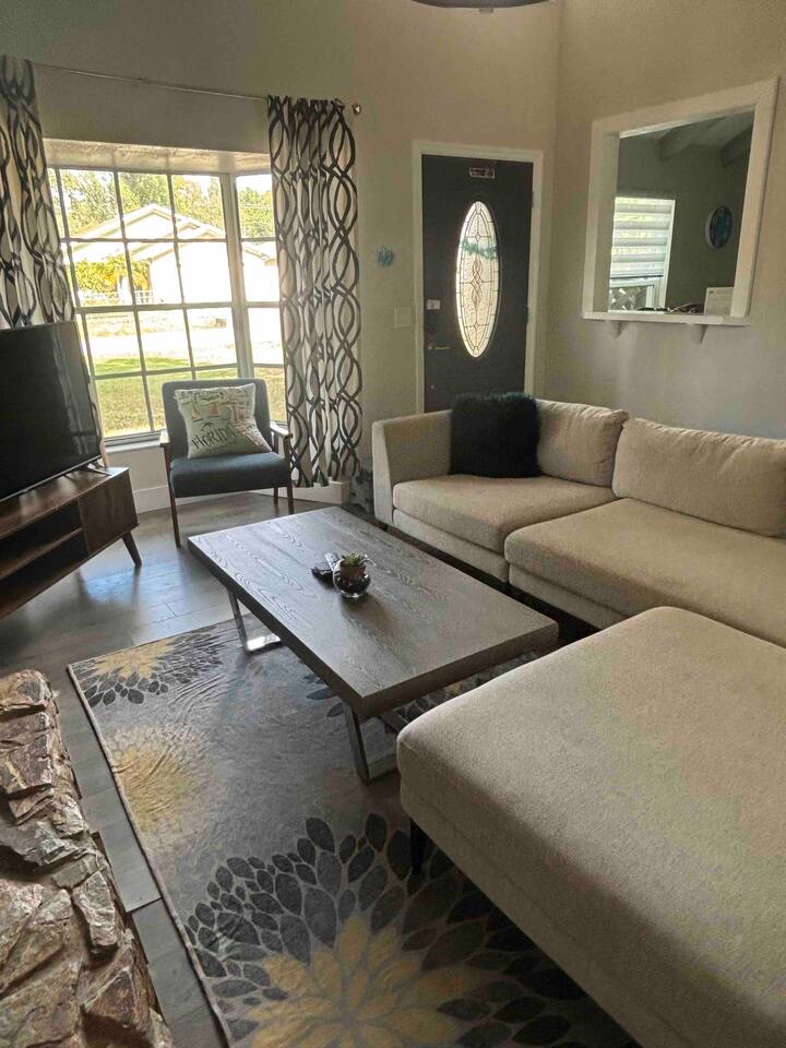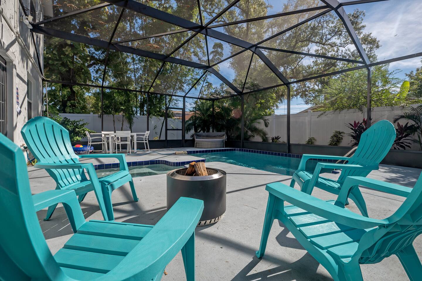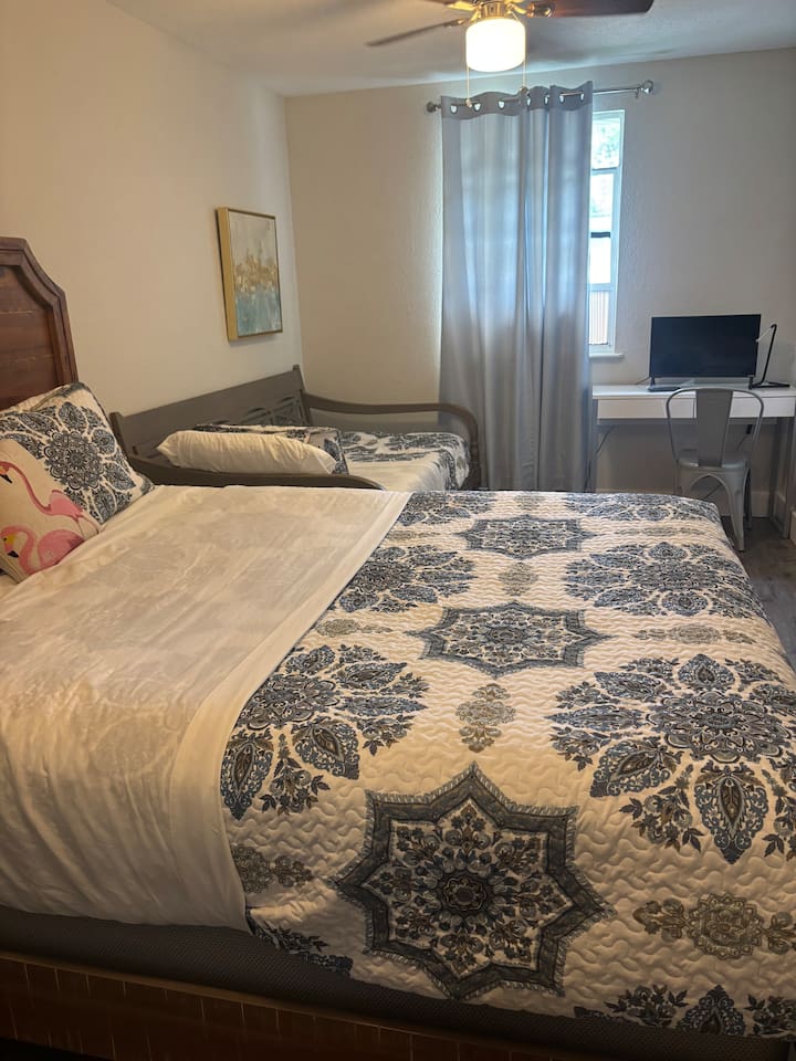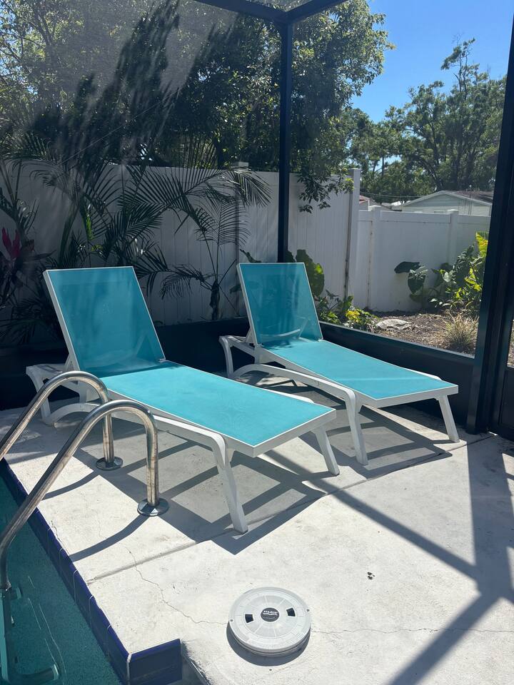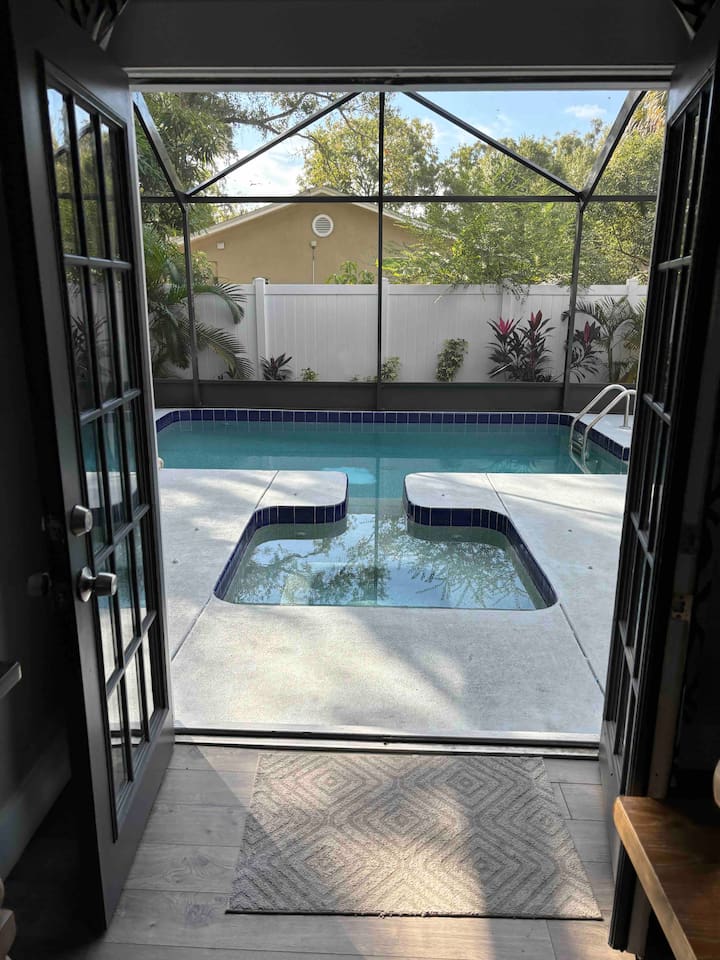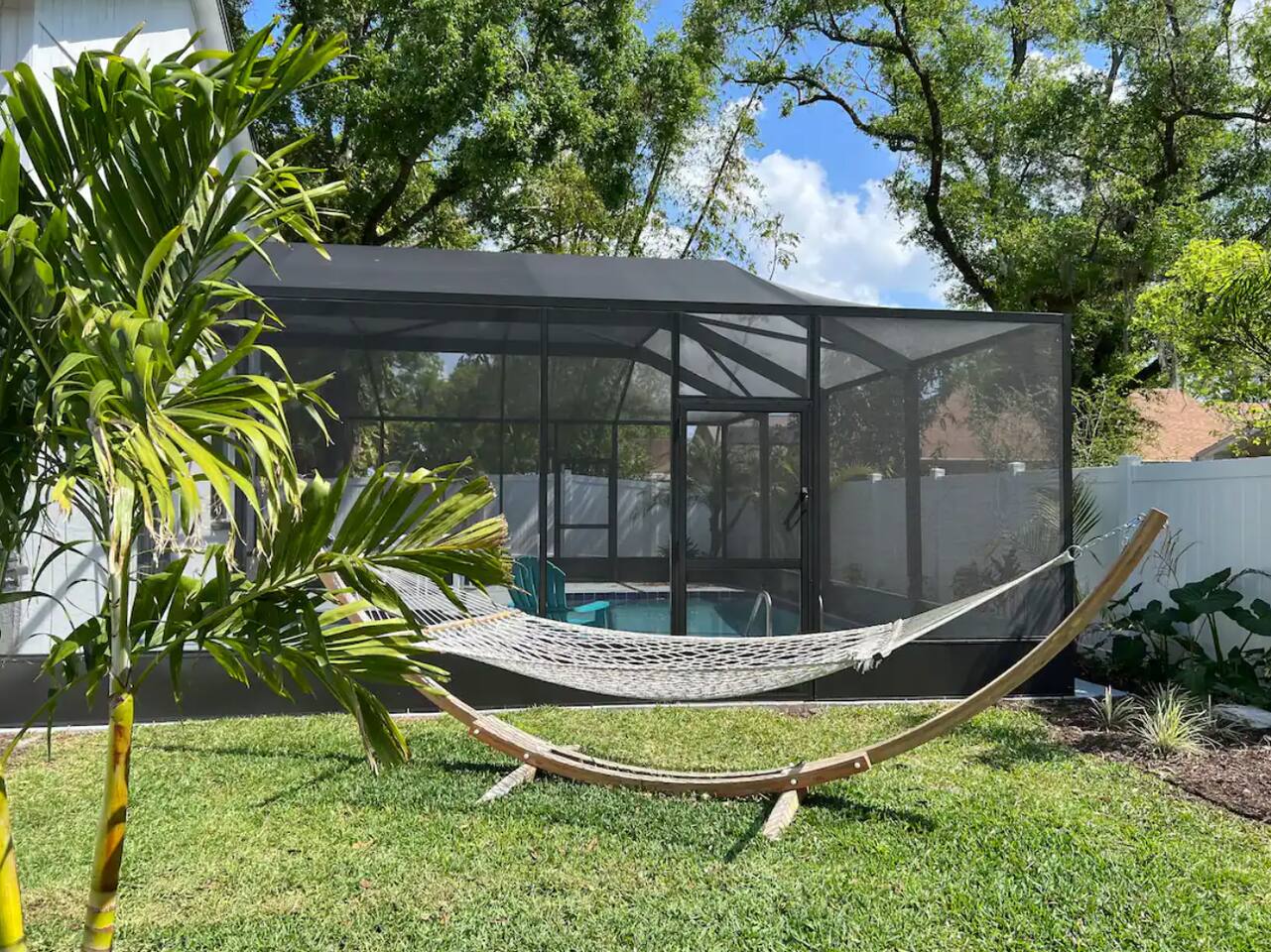 🏡 The Space “Could this home BE any more perfect?” 😉 This 3BR/2BA retreat features: Vaulted ceilings & modern design Heated screened pool + hammock lounge Smart TVs in living room and ALL Bedrooms! Fully stocked kitchen + dining area Fresh furnishings, hotel-grade linens & fast WiFi Sleeping Arrangements: Upstairs Master: 1 King + 1 Queen w/ ensuite bath Downstairs Pool View Room: 1 Queen + high-end twin folding bed + Crib Downstairs Rear Bedroom: 1 Queen & 1 twin day bed Sectional sofa also works for extra sleeping. The home does have a wood burning fireplace, for decorative purposes only! We do not allow guests to have any open flames in the home. We have not had the chimney inspected so we ask that you respect the no fire in the fireplace rule! Bed configuration: 1 King bed-Master Bedroom Upstairs 1 Queen bed-Master Bedroom Upstairs 1 Twin Bed- Rear Bedroom Downstairs 1 Queen Bed- Rear Bedroom Downstairs- 1 Twin Daybed 1 Queen Bed- Pool View Bedroom Downstairs &1 Twin folding bed Smart Tv's are located in the Living area and ALL Bedrooms. Why guests love it 👨👩👧 Families: Lots of space to spread out, fenced yard, pack ’n play, Crib, kids’ dinnerware, minutes from Busch Gardens , downtown & ZooTampa. 💻 Digital Nomads: fast Wi-Fi, Ethernet, dedicated workspace, quiet neighborhood yet close to downtown. 💕 Couples: king suite with en suite, private heated, cozy vibe—perfect for a romantic escape or groups. Location highlights 10 min → Busch Gardens & Adventure Island 10 min → Steinbrenner Field Raymond James Stadium Amalie Arena (Now Benchmark International Arena) 10 min → USF & Moffitt Cancer Center 10 min → Downtown Tampa, Riverwalk, Armature Works 10 min → Tampa International Airport 30–40 min → Beaches & Clearwater Pickleball Courts nearby @ Rowlett Park: This park in East Tampa has eight outdoor courts with permanent nets. It is open to the public for free. Apx 3 miles