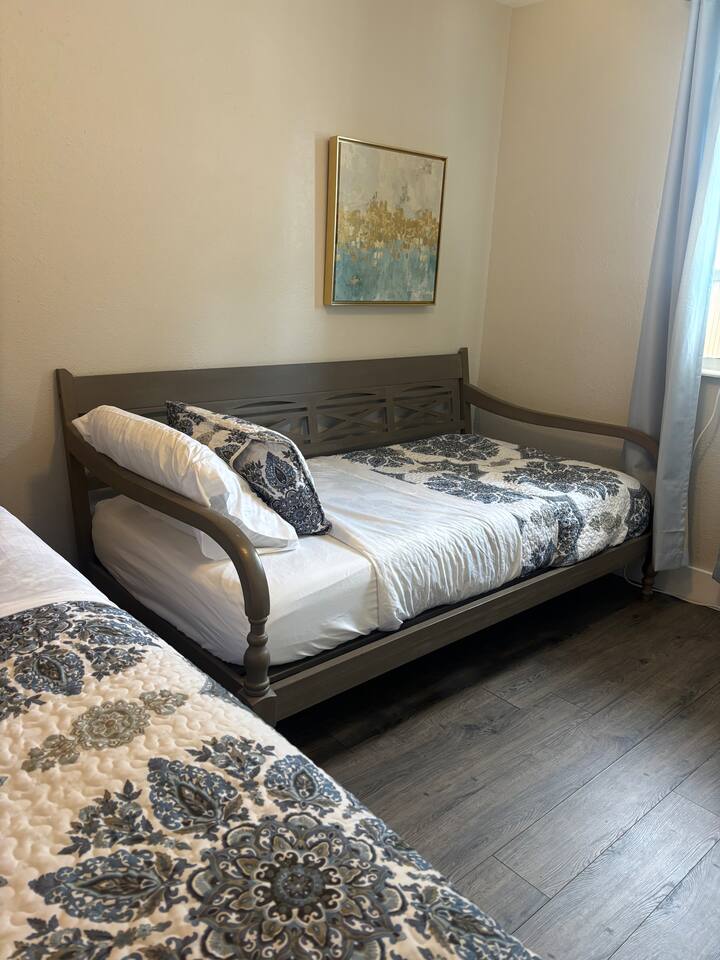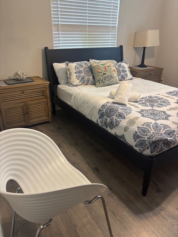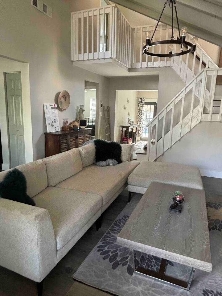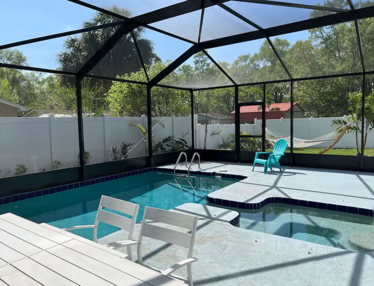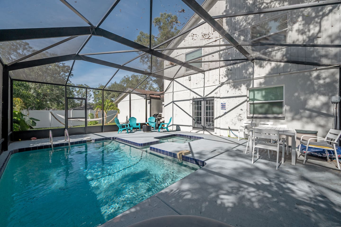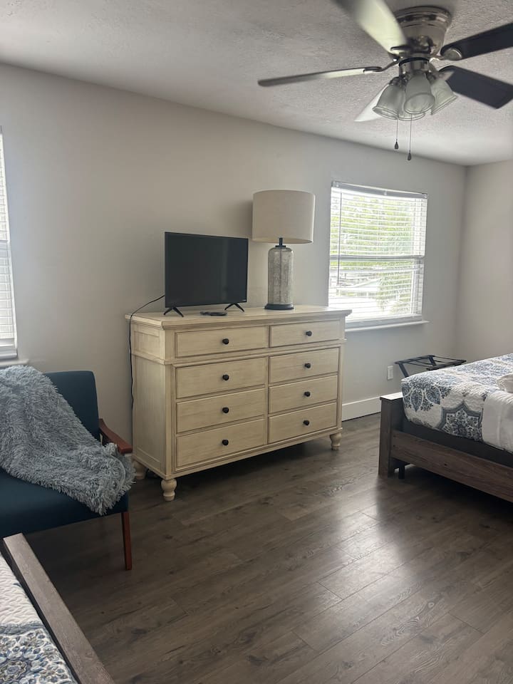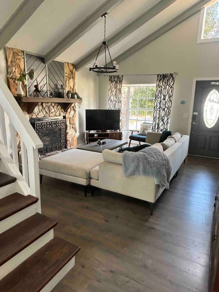 🏡 The Space “Could this home BE any more perfect?” 😉 This 3BR/2BA retreat features: Vaulted ceilings & modern design Heated screened pool + hammock lounge Smart TVs in living room and ALL Bedrooms! Fully stocked kitchen + dining area Fresh furnishings, hotel-grade linens & fast WiFi Sleeping Arrangements: Upstairs Master: 1 King + 1 Queen w/ ensuite bath Downstairs Pool View Room: 1 Queen + high-end twin folding bed + Crib Downstairs Rear Bedroom: 1 Queen & 1 twin day bed Sectional sofa also works for extra sleeping. The home does have a wood burning fireplace, for decorative purposes only! We do not allow guests to have any open flames in the home. We have not had the chimney inspected so we ask that you respect the no fire in the fireplace rule! Bed configuration: 1 King bed-Master Bedroom Upstairs 1 Queen bed-Master Bedroom Upstairs 1 Twin Bed- Rear Bedroom Downstairs 1 Queen Bed- Rear Bedroom Downstairs- 1 Twin Daybed 1 Queen Bed- Pool View Bedroom Downstairs &1 Twin folding bed Smart Tv's are located in the Living area and ALL Bedrooms. Why guests love it 👨👩👧 Families: Lots of space to spread out, fenced yard, pack ’n play, Crib, kids’ dinnerware, minutes from Busch Gardens , downtown & ZooTampa. 💻 Digital Nomads: fast Wi-Fi, Ethernet, dedicated workspace, quiet neighborhood yet close to downtown. 💕 Couples: king suite with en suite, private heated, cozy vibe—perfect for a romantic escape or groups. Location highlights 10 min → Busch Gardens & Adventure Island 10 min → Steinbrenner Field Raymond James Stadium Amalie Arena (Now Benchmark International Arena) 10 min → USF & Moffitt Cancer Center 10 min → Downtown Tampa, Riverwalk, Armature Works 10 min → Tampa International Airport 30–40 min → Beaches & Clearwater Pickleball Courts nearby @ Rowlett Park: This park in East Tampa has eight outdoor courts with permanent nets. It is open to the public for free. Apx 3 miles